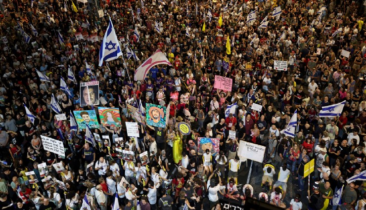 İsrail’de esir yakınları ve onlara destek olmak isteyen binlerce gösterici başken Tel Aviv’de bir araya geldi. Kirya Askeri Üssü yakınlarında toplanan binlerce İsrailli Başbakan Binyamin Netanyahu ve hükümetine Gazze Şeridi’nde ateşkes ve esir anlaşması müzakerelerinde sergiledikleri politika nedeniyle tepki gösterdi. Devletin sabotajcısı olarak nitelendirilen Netanyahu için “Suçlusun”, “Doğrudan hapse gir” pankartları açan İsrailliler, esir anlaşmasının bir an önce imzalanmasını talep ederken, istifa çağrısı yaptı.