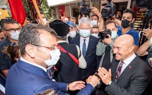 Müze gezisinin ardından İzmir Büyükşehir Belediye Başkanı Tunç Soyer ve İstanbul Büyükşehir Belediye Başkanı Ekrem İmamoğlu Tarihi Kemeraltı Çarşısı’nda yurttaşların yoğun ilgisiyle karşılaştı.