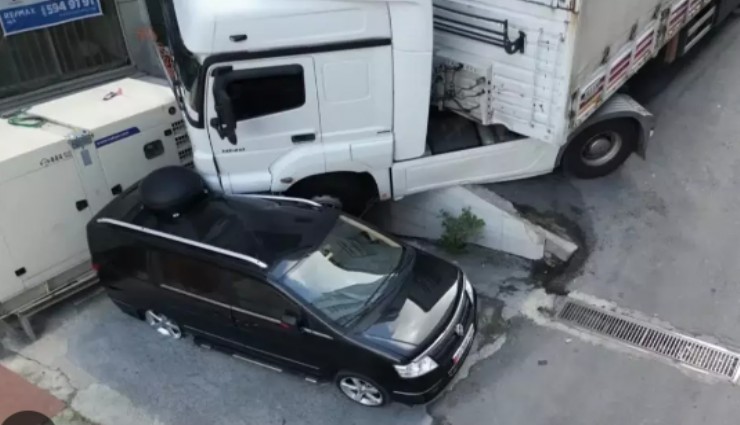 İstanbul'da yürekleri ağıza getiren kaza: Yokuş aşağı kayan tır park halindeki aracın üzerine düştü