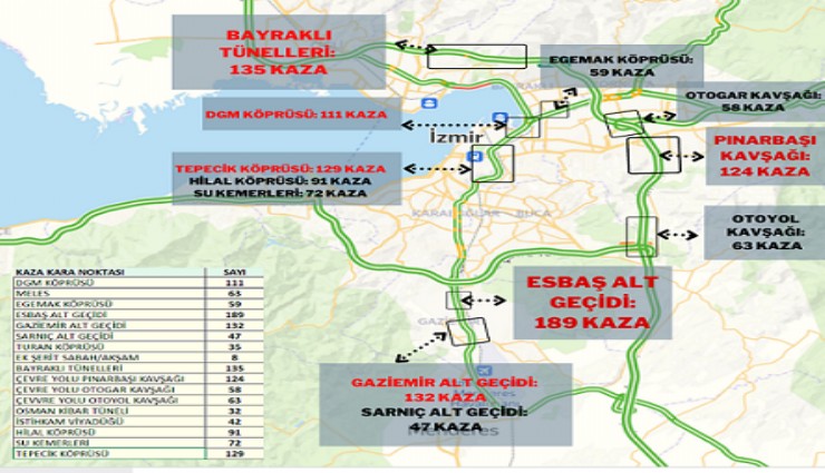 Son 6 ayda meydana gelen 6 binin üzerindeki kazanın ardından bazı bölgeler “kaza kara noktası” olarak dikkati çekti. Gaziemir Akçay Caddesi üzerinde bulunan ESBAŞ Alt Geçidi ve çevresinde aylık ortalama 30’un üzerinde, toplamda da 189 trafik kazası oldu. Yine Akçay Caddesi üzerindeki Gaziemir Alt Geçidi bölgesinde ise 132 trafik kazası meydana geldi.