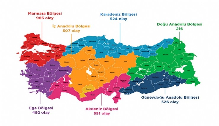 Silahlı şiddetin en çok arttığı bölge olarak Akdeniz dikkat çekerken Ege ve İç Anadolu’da ise yüzde 6’lık bir düşüş meydana geldi. Ege Bölgesi 2020 yılında şiddetin en çok yaşandığı bölgeler sıralamasında üçüncü sıradayken 2021 yılında altıncı sıraya geriledi, ateşli ve delici silahların kullanıldığı olaylardaki ölümler açısından bakıldığında ise üçüncü sıradaki yerini korumaya devam etti. En çok olayın yaşandığı 10 il ise sırasıyla; İstanbul, Adana, Samsun, İzmir, Bursa, Şanlıurfa, Antalya, Kocaeli, Konya, Diyarbakır olarak kayıtlara geçti.