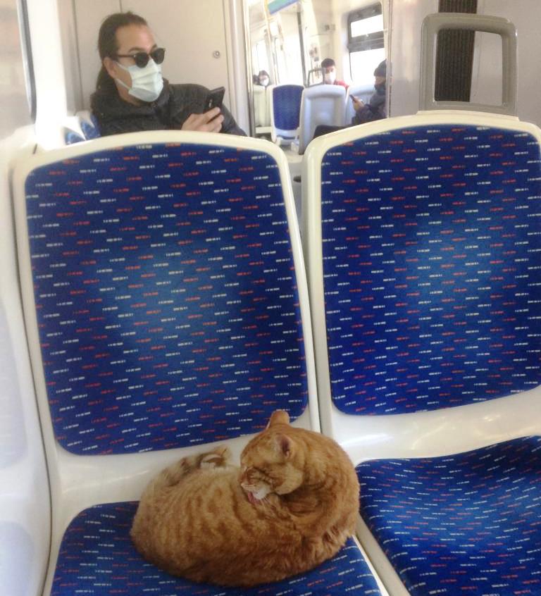 Aliağa ile Selçuk Tepeköy arasındaki raylı sistem hattında hizmet veren İZBAN her gün yüzbinlerce İzmirliyi evine, işine, okuluna, hastaneye ya da gedeceği yere ulaştırıyor. İZBAN’nın misafirleri arasında bu koşuşturmacada sevimli sevimli bir misafir daha var. Her gün İZBAN’a binenler sevimli bir kediyle karşılaşıyor. Vagonları kendisine ev edinen minik kedi yolcuların stresini alıyor ve gülümsemesini sağlıyor. Onun kurulduğu koltuklara kimse müdahale etmiyor. (FOTOĞRAF: ŞÜKRÜ AKIN)