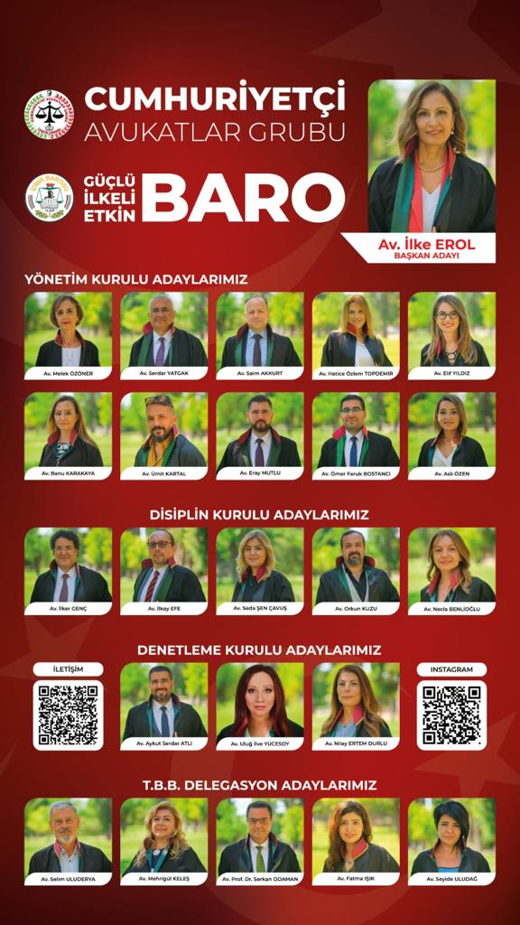 İzmir Barosu, haksızlıklara karşı tavır alan İzmir duruşunu sergileyecektir. Özgür, tam bağımsız, laik, demokratik, sosyal hukuk devletinin Atatürk’ün hedeflediği modern Türkiye Cumhuriyeti idealinin savunucusu ve uygulayıcısı olarak ilerleyeceğimiz bu yolda İzmir Barosu’nu sahadan gelen, mesleki sorunlara hakim, çözüm odaklı hizmet anlayışındaki çalışma arkadaşlarımızla birlikte ve meslektaşlarımızın da katılımları ile yönetmeye hazırız.