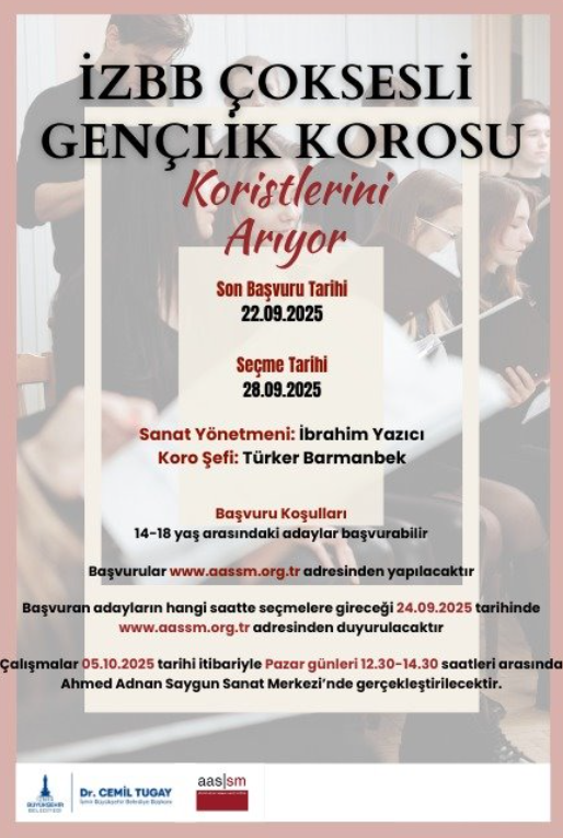 İzmir Büyükşehir Belediyesi Çoksesli Gençlik Korosu’na 14-18 yaş arasındaki adaylar başvurabiliyor. Başvurular https://www.aassm.org.tr/ adresindeki “Başvuru Yap” bölümden yapılıyor. Başvuran adayların hangi saatte seçmelere gireceği 24 Eylül tarihinde www.aassm.org.tr adresinden duyurulacak. Seçmeler, Ahmed Adnan Saygun Sanat Merkezi Küçük Salon’da saat 09.00’da İbrahim Yazıcı’nın sanat yönetmenliği, Türker Barmanbek’in koro şefliğinde yapılacak. Çalışmalar, 5 Ekim tarihi itibariyle pazar günleri 12.30-14.30 saatleri arasında Ahmed Adnan Saygun Sanat Merkezi’nde gerçekleştirilecek.