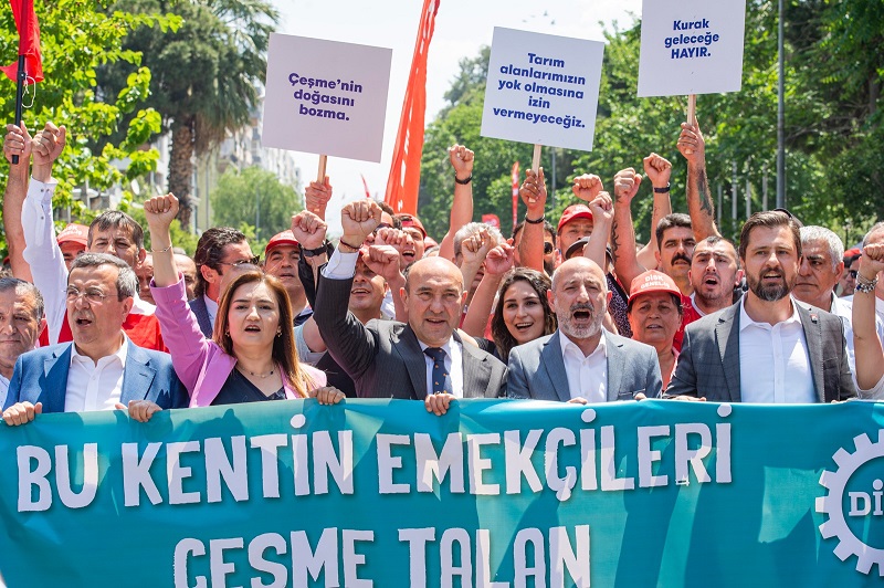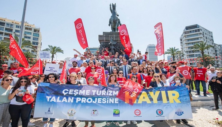 Cumhuriyet Halk Partisi (CHP) Genel Başkan Yardımcısı Ali Öztunç, İzmir Büyükşehir Belediye Başkanı Tunç Soyer, CHP İzmir Milletvekili Sevda Erdan Kılıç, Konak Belediye Başkanı Abdül Batur ve CHP İzmir İl Başkanı Deniz Yücel, meslek odaları, sendikalar ve sivil toplum kuruluşlarının temsilcileri ile Kültürpark Lozan Meydanı’nda buluştu. “Bu kentin emekçileri Çeşme talan projesine hayır diyor” pankartının arkasında kortej Cumhuriyet Meydanı’na yürüdü. Yürüyüşte sık sık “İzmir Çeşme’ye sahip çık”, “Kurtuluş yok ya hep beraber ya hiç birimiz” sloganları atıldı.