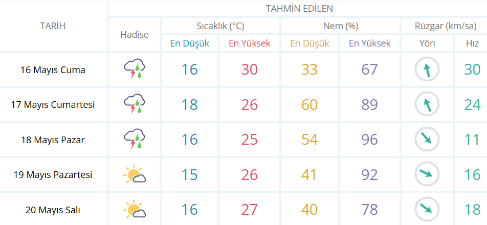 Meteoroloji Genel Müdürlüğü'nün açıkladığı verilere göre, İzmir'de yarın itibariyle 3 günlük yağış bekleniyor. Verilere göre, yarın 16 Mayıs Cuma, 17 Mayıs Cumartesi, 18 Mayıs Pazar günleri kentte yağış etkili olacağı tahmin ediliyor. Sıcaklık ise ortalama 23 derece olacağı öngörülüyor.