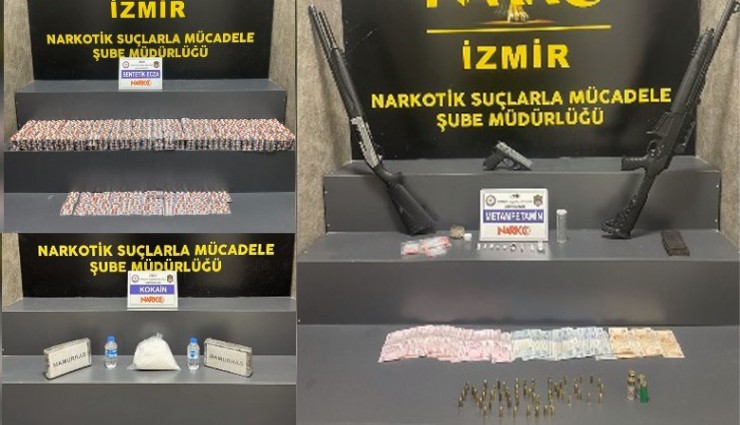 İzmir İl Emniyet Müdürlüğü Narkotik Suçlarla Mücadele Şube Müdürlüğü ekipleri, 19-25 Mart tarihleri arasında il genelinde 69 ayrı operasyon gerçekleştirdi. Adreslerde yapılan aramalarda, 6 kilo 490 gram esrar-skank, 3 kilo 251 gram kokain, 799 gram metamfetamin, 371 gram sentetik kannabinoid (bonzai vb.), 16 bin 528 adet sentetik ecza, çeşitli uyuşturucu türlerinden satışa hazır hale getirilmiş vaziyette bir miktar uyuşturucu madde, 8 adet hassas terazi, 6 adet tabanca, 2 adet tüfek, 86 adet tabanca/tüfek fişeği ve suçtan elden edilen 111 bin 170 Türk Lirası ele geçirildi.