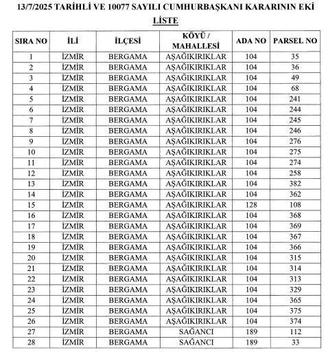 Kamulaştırılacak 28 taşınmaz, Bergama’nın Aşağıkırıklar ve Sağancı mahallelerinde bulunuyor.