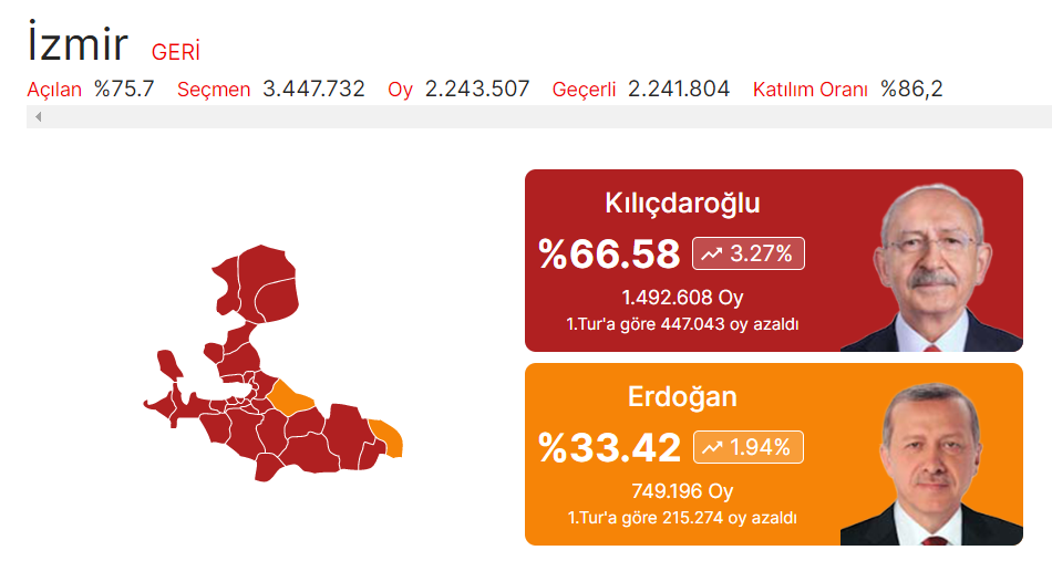İzmir'de açılan sandık yüzde 75: Kılıçdaroğlu yüzde 67, Erdoğan yüzde 34