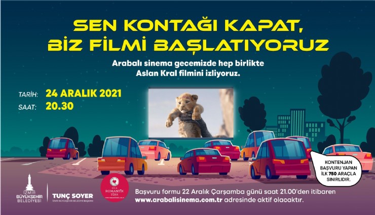 İzmir Büyükşehir Belediyesi, 1950’li yıllarda Amerika’da ortaya çıkan ve sonrasında tüm dünyada yaygınlaşan Arabalı Sinema (Drive-in Movie) etkinliğini 24 Aralık Cuma günü İzmirlilerle birlikte yapacak. Yavru bir aslan olan Simba’nın maceralarını konu edinen iki saatlik “Aslan Kral” filmi 20.30’da başlayacak. Sinemaseverler, arabalarından inmeden sinema keyfi yaşayacak. İzmirliler İnciraltı Demokrasi Meydanı, Gaziemir Fuar İzmir, Buca Eski Pazar Yeri, Çiğli Egekent Parkı yanı, Bornova Aşık Veysel Rekreasyon Alanı Havuz İzmir yanı, Mavişehir İZBAN Durağı karşısı olmak üzere altı noktada etkinliğe katılabilecek.