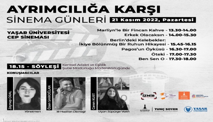 İzmir Büyükşehir Belediyesi Sosyal Projeler Dairesi Başkanlığı’na bağlı Kentsel Adalet ve Eşitlik Şube Müdürlüğü, Kadın Çalışmaları Şube Müdürlüğü ile Yaşar Üniversitesi işbirliği, İzmir Sinema Ofisi ve Uçan Süpürge Vakfı desteğiyle düzenlenen Ayrımcılığa Karşı Sinema Günleri başlıyor. 21 ve 23 Kasım’da İzmir Büyükşehir Belediyesi Mahallimizin Kadınları Sinema Yapıyor projesi, Yaşar Üniversitesi mezuniyet filmleri ve Uçan Süpürge Vakfı arşivinden seçilen filmler ücretsiz olarak Yaşar Üniversitesi Cep Sineması’nda gösterilecek. Etkinlik kapsamında film gösterimleri eşliğinde yönetmen, akademisyen ve aktör katılımcılarla bir söyleşi dizisi de yapılacak.