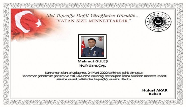 Milli Savunma Bakanı Hulusi Akar ise İzmir’de Eğitim esnasında yaşanan silah kazası sonucu şehit olan asker için başsağlığı mesajı yayımladı. Mesajda, “Kahraman Silah arkadaşımız, 24 Mart 2022 tarihinde şehit olmuştur. Kahraman şehidimize şahsım ve Milli Savunma Bakanlığı mensupları adına Allah’tan rahmet; kederli ailesine ve asil milletimize başsağlığı ve sabır dilerim” ifadelerine yer verdi.