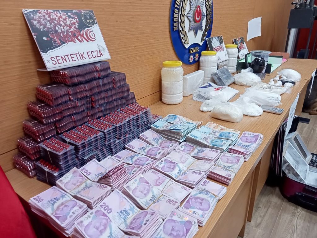 İzmir İl Emniyet Müdürlüğü Narkotik Suçlarla Mücadele Şube Müdürlüğü ekipleri, Karşıyaka ilçesinde ikamet eden F.Y.B.’nin evinde uyuşturucu madde imal ettiği ve torbacı olarak nitelenen sokak satıcılarına uyuşturucu temin ettiği bilgisi üzerine çalışma başlattı. Uzun süren takibin ardından, düğmeye basan ekipler belirlenen adrese operasyon gerçekleştirdi. Adreste yapılan aramada, 13 bin 500 gram kokain, 5 kilogram metamfetamin,7 bin 731 adet extacy hap ve 6 bin 272 adet sentetik ecza ile kokain pres makinesi, 2 hassas terazi, 2 ruhsatsız tabanca, 793 adet tabanca mermisi, 30 adet uzun namlulu silah fişeği ve uyuşturucu madde ticaretinden elde edildiği değerlendirilen 540 bin lira ele geçirildi.
