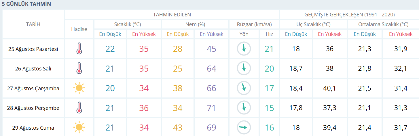 25 Ağustos Pazartesi: Güneşli hava hakim olacak. En düşük sıcaklık 22, en yüksek 35 derece.