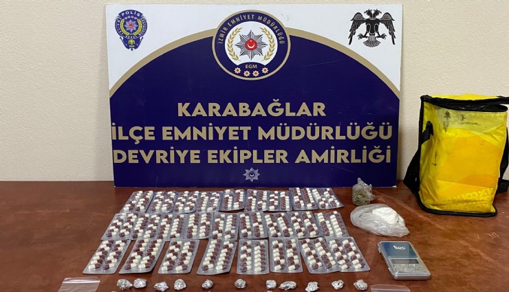 Karabağlar İlçe Emniyet Müdürlüğüne bağlı Devriye Ekipler Amirliği ekipleri, bugün akşam saatlerinde Peker Parkı'nda bir kişinin kendilerini görünce panik yaparak bir şeyleri çöpe attığını fark etti. Yapılan kontrolde çöp içerisine atılan sarı renkli soğutucu çanta içerisinde 39 meşe halinde satışa hazır esrar maddesi, plastik Pet bardak içerisinde bir miktar esrar, 353 uyuşturucu nitelikli hap ve 1 hassas terazi ele geçirildi.