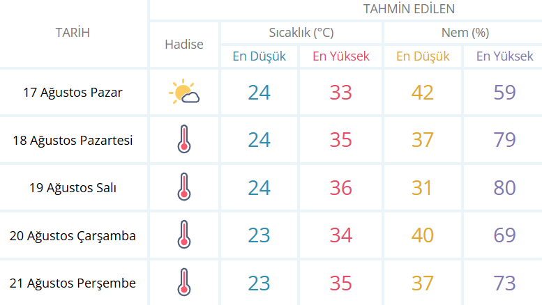 Meteoroloji 2. Bölge Müdürlüğü İzmir ilçelerinin 17 Ağustos Pazar günü için hava raporunu açıkladı. Verilere göre İzmir genelinde yakıcı sıcaklıklar etkisini kaybetti. İşte ilçe ilçe hava raporu...
