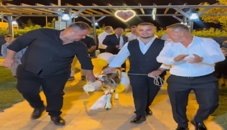 İzmir’in Bergama ilçesindeki bir düğünde damat Onur Söke’ye alışılmadık bir takı geldi. Sağdıç Mehmet Ali Dağ damada bir buzağı hediye etti. Oyun havası eşliğinde ve süt içirilerek salona getirilen buzağı davetlilerin ilgisini çekti.