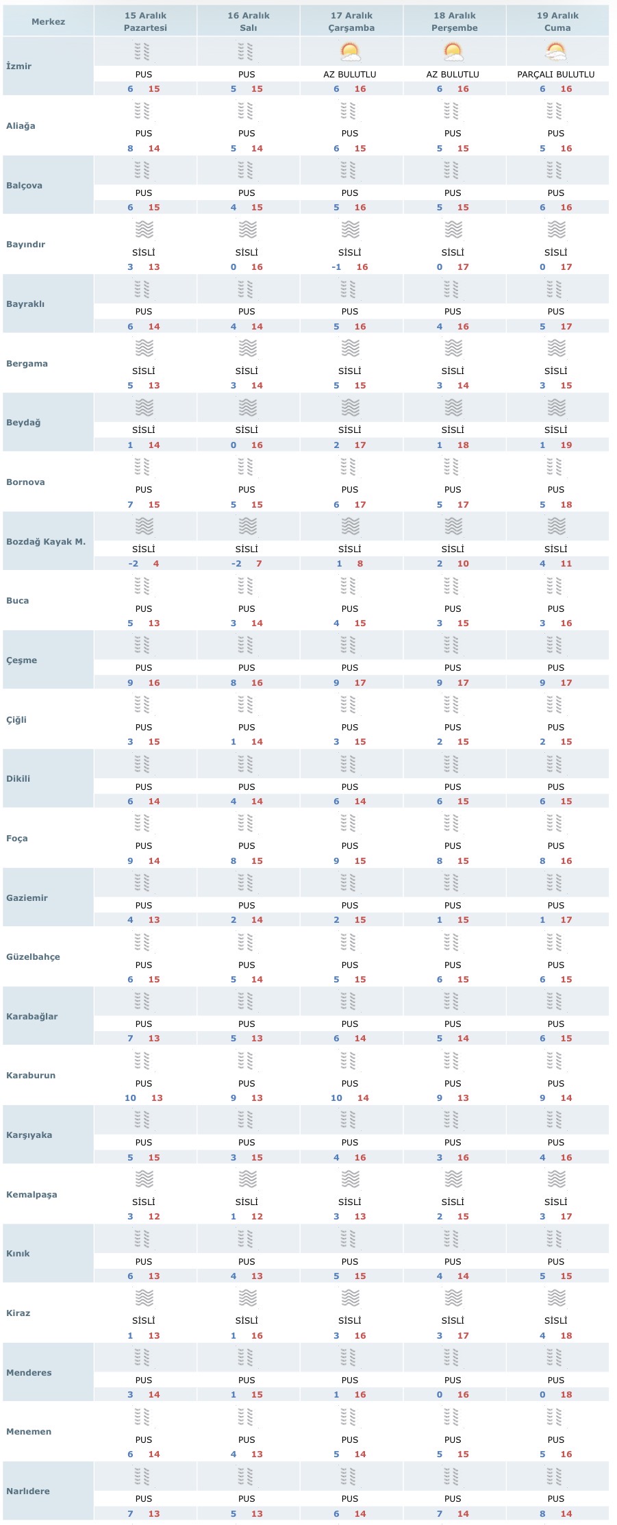 Merkez ilçeler Konak, Karşıyaka, Bornova, Bayraklı, Buca, Karabağlar, Narlıdere ve Gaziemir’de hava çoğunlukla puslu. Gün içinde sıcaklıklar 14–17 derece civarında ölçülürken, sabah saatlerinde sis etkisini gösteriyor.