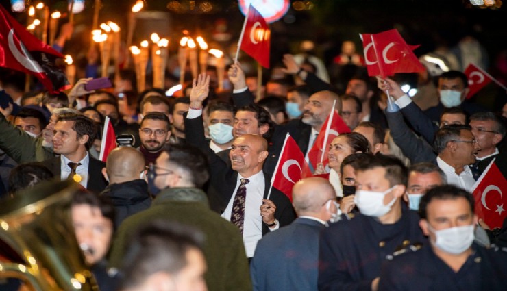 Cumhuriyet'in kenti İzmir'de, İzmir Büyükşehir Belediyesi'nin düzenlediği etkinliklerle kentin tüm ilçeleri ve mahallelerine yayılan 29 Ekim Cumhuriyet Bayramı coşkusu, Cumhuriyet Meydanı’ndan başlayarak Gündoğdu Meydanı’na kadar süren fener alayı ve sanatçı Sıla konseriyle son buldu. Cumhuriyet Meydanı’ndan başlayan korteje İzmir Büyükşehir Belediye Başkanı Tunç Soyer, CHP İzmir Milletvekili Özcan Purçu, Menderes Belediye Başkanı Mustafa Kayalar ile eşi Aslı Kayalar, CHP İzmir İl Başkanı Deniz Yücel, İzmir Büyükşehir Belediyesi Meclis Üyesi Nilay Kökkılınç, İzmir Büyükşehir Belediye Başkan Vekili Mustafa Özuslu, İzmir Büyükşehir Belediyesi Genel Sekreteri Dr. Buğra Gökçe, İzmir Büyükşehir Belediyesi Genel Sekreter Yardımcısı Ertuğrul Tugay, CHP İzmir Gençlik Kolları Başkanı Burak Kotan, bürokratlar, meclis üyeleri, sivil toplum kuruluşları, odalar ve derneklerin başkanları ile temsilcileri ve yurttaşlar katıldı. Başkan Soyer, kortej sırasında sık sık yurttaşları selamladı ve bayramlarını kutladı. İzmir Büyükşehir Belediyesi Bandosu’nun çaldığı marşlara eşlik eden İzmirliler 350 metrelik Türk bayrağını gururla taşıdı.