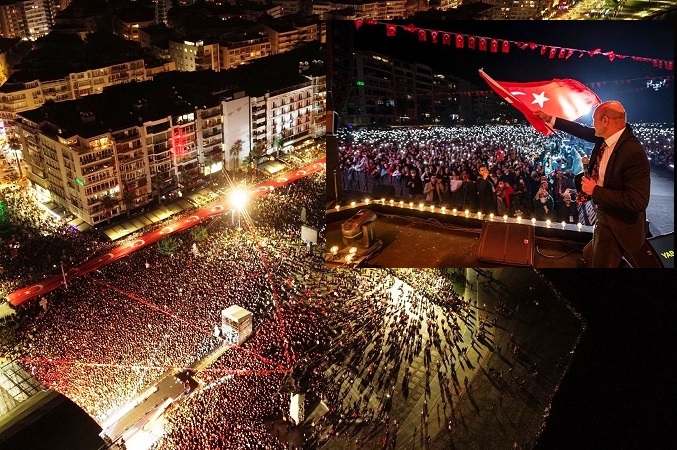 İzmir’de Cumhuriyet'in kuruluşunun 98. yılı gece de büyük coşkuyla kutlandı. On binlerce İzmirlinin katıldığı kortejde 350 metrelik Türk bayrağı taşındı, fener alayının ardından sevilen sanatçı Sıla sahne aldı. İzmir Büyükşehir Belediye Başkanı Tunç Soyer, Gündoğdu Meydanı’nı dolduran İzmirliye “Kurtuluşun ve kuruluşun şehri İzmir, Cumhuriyet'in ikinci yüzyılında da bütün Türkiye’ye ışık tutacak. Türkiye’nin her yerinde çiçekler açacak. Hepinizi çok seviyorum, bayramımız kutlu olsun” diye seslendi.