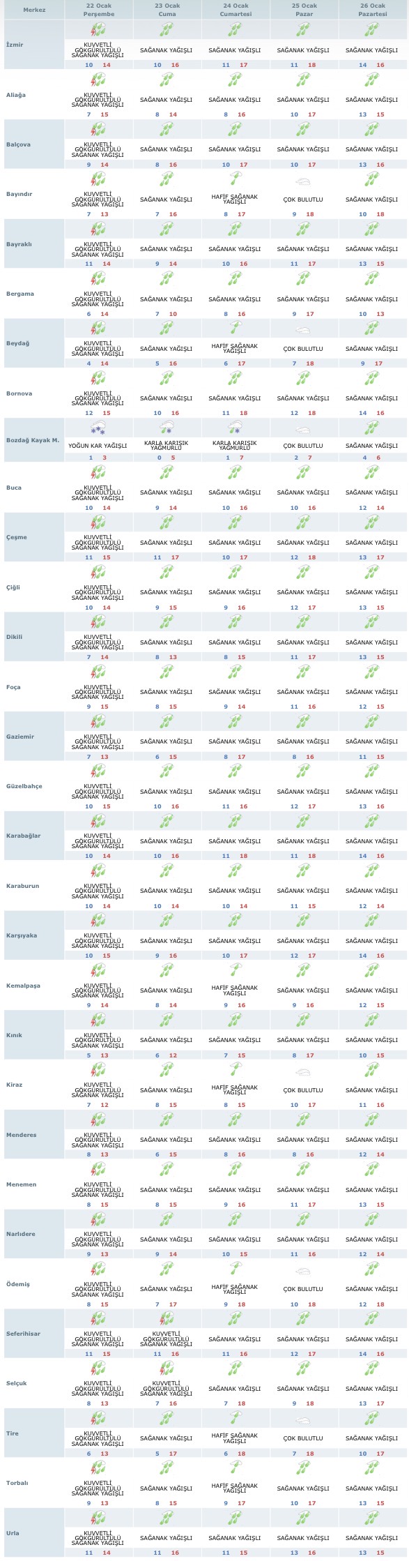 Merkez ilçeler Konak, Karşıyaka, Bornova, Bayraklı, Buca, Balçova, Narlıdere, Karabağlar ve Gaziemir’de hafta genelinde sağanak yağışlı hava öne çıkıyor. Zaman zaman kuvvetli yağış geçişleri görülmesi beklenirken, sıcaklıkların gece saatlerinde 7-10 dereceye kadar düşeceği, gündüz saatlerinde ise 14-17 derece civarında seyredeceği bildirildi. Özellikle sabah ve akşam saatlerinde rüzgârın etkisiyle hissedilen sıcaklığın daha düşük olması bekleniyor.