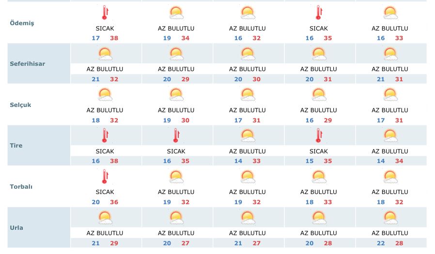 İzmir'de önümüzdeki hafta boyunca yaz etkisini sürdürmeye devam edecek. Meteoroloji verilerine göre özellikle iç kesimlerde sıcaklıklar 35°C'nin üzerine çıkarken, kıyı bölgelerde ise az bulutlu ve sıcak bir hava hâkim olacak. İşte ilçelere göre hava durumu verileri: