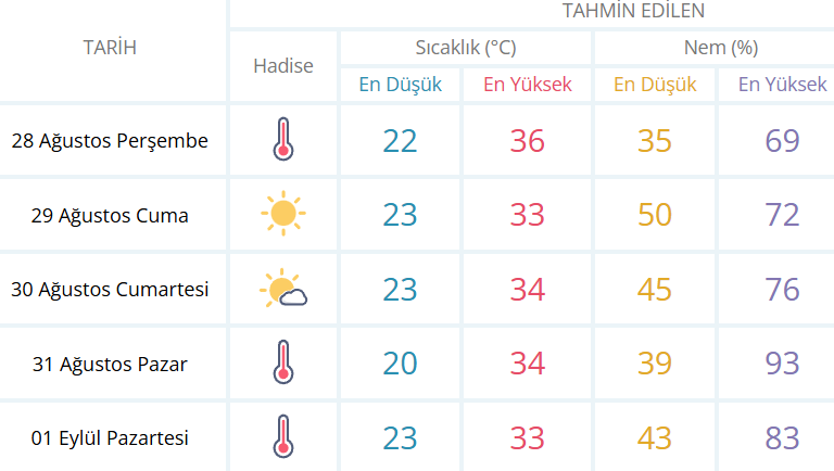 İzmir için 5 günlük genel hava raporu ise şu şekilde: