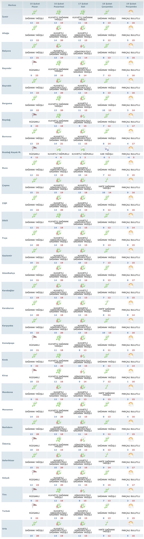 İzmir genelinde yeni haftayla birlikte yağışlı hava dalgası etkisini artırıyor. Meteoroloji verilerine göre 15 Şubat Pazar günü başlayan sağanak yağışlar, 16 ve 17 Şubat tarihlerinde kuvvetlenerek il genelinde etkili olacak. Özellikle merkez ilçeler başta olmak üzere Aliağa, Bornova, Karşıyaka, Buca, Çiğli ve Konak çevresinde kuvvetli ve yer yer gök gürültülü sağanak yağış bekleniyor.