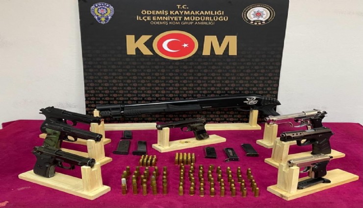 İzmir’in Ödemiş ilçesinde polis ekiplerince düzenlenen operasyonda 7 adet ruhsatsız tabanca ve çok sayıda fişek ele geçirildi.