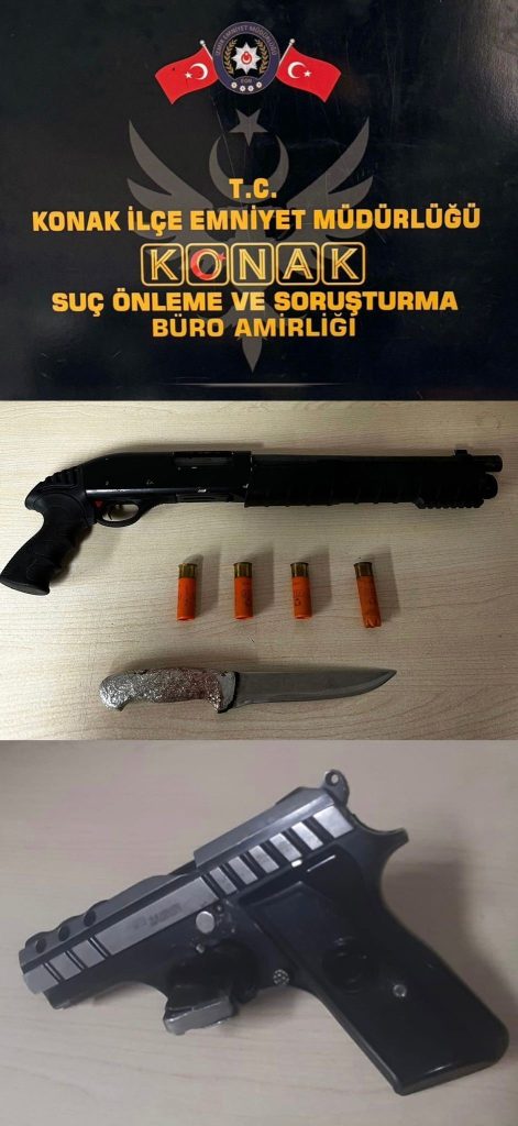 Edinilen bilgiye göre, dün akşam Kıbrıs Şehitleri Caddesi'nde iki grup arasında henüz belirlenemeyen nedenle tartışma çıktı. Silahlı ve bıçaklı kavgaya dönüşen olayda, 17 yaşındaki M.A., Ş.E.'yi (27) bıçakla yaralarken, 37 yaşındaki M.E. ise darp sonucu yaralandı. Konak İlçe Emniyet Müdürlüğü Suç Önleme ve Soruşturma Büro Amirliği ekipleri, olayın ardından kaçan şüphelileri yakalamak için çalışma başlattı. Çevredeki güvenlik kameralarını inceleyen ekipler, kimlikleri tespit edilen İ.A. (41), M.A. (17), M.A. (16) ve E.A.'yı (19) kavgada kullandıkları tabanca, pompalı tüfek ve bıçakla yakaladı. Şüphelilerin emniyetteki işlemlerinin sürdüğü öğrenildi.