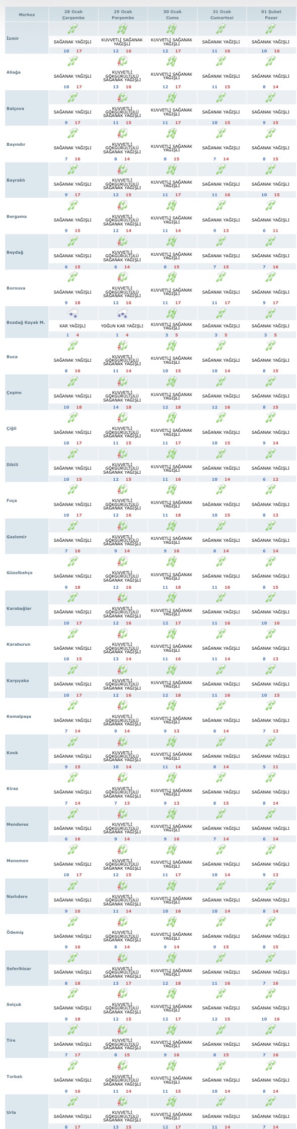 İzmir merkez, Aliağa, Bornova, Karşıyaka, Buca, Gaziemir ve Karabağlar gibi yoğun nüfuslu ilçelerde hafta boyunca aralıklarla sağanak yağış görülmesi öngörülüyor. Kıyı ilçeleri olan Çeşme, Foça, Urla ve Seferihisar’da da yağışlı hava hakim olacak. Yağışların zaman zaman kuvvetini artırması nedeniyle ani su baskınları, taşkınlar ve trafikte aksamalara karşı dikkatli olunması isteniyor.