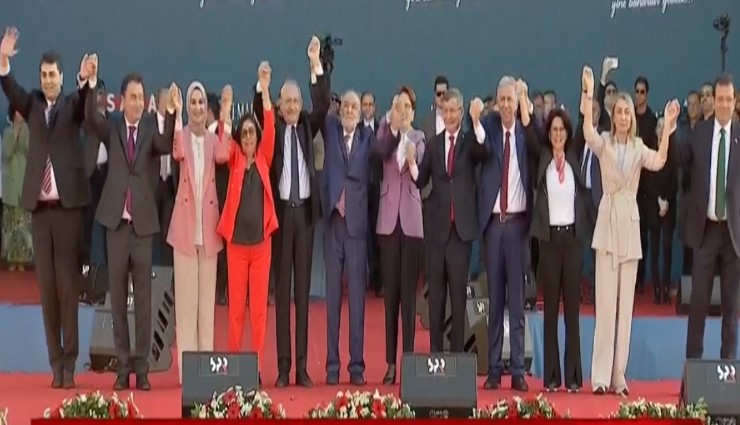 Millet İttifakı’nın İzmir Gündoğdu Meydanı’ndaki “Millet Buluşması” mitingi renkli görüntülere sahne oldu. Gündoğlu Meydanı ile Cumhuriyet Meydanı arasındaki bölge yüzbinlerce İzmirli tarafından dolduruldu. Mitinge; Millet İttifakı Genel Başkanı ve CHP Genel Başkanı Kemal Kılıçdaroğlu, İYİ Parti Genel Başkanı Meral Akşener, Saadet Partisi Genel Başkanı Temel Karamollaoğlu, Gelecek Partisi Genel Başkanı Ahmet Davutoığlu, DEVA Partisi Genel Başkanı Ali Babacan ve Demokrat Parti Genel Başkanı Gültekin Uysal ile CHP’li 11 belediye başkanı katıldı. Liderler yüzbinlerce İzmirliye birlikte ellerini kaldırarak poz verdi.