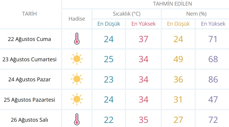Meteoroloji 2. Bölge Müdürlüğü İzmir ilçelerinin 22 Ağustos Cuma günü için hava raporunu açıkladı. Verilere göre İzmir genelinde sıcaklık artışları devam ediyor. İşte ilçe ilçe hava raporu...