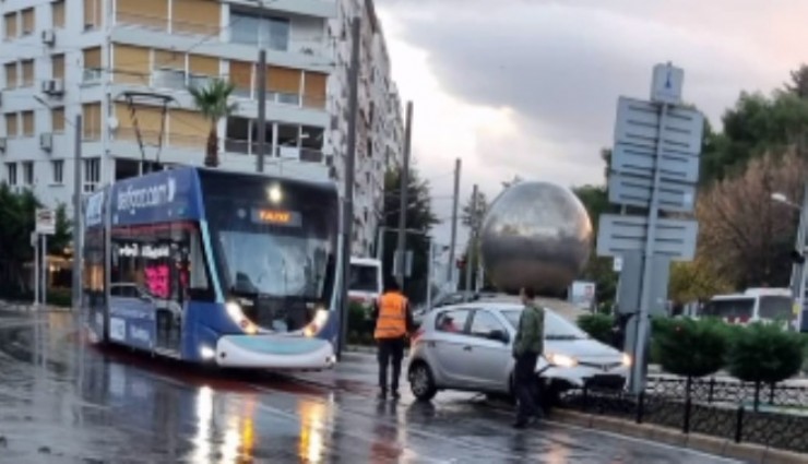 İzmir'in Konak ilçesinde tramvay ile otomobil çarpıştı. Maddi hasarlı kaza sebebiyle tramvay seferlerinde aksamalar yaşandı.