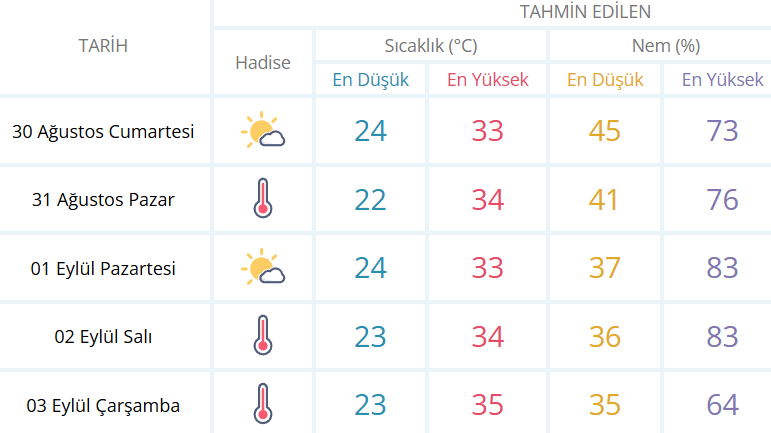 İzmir için 5 günlük genel hava raporu ise şu şekilde: