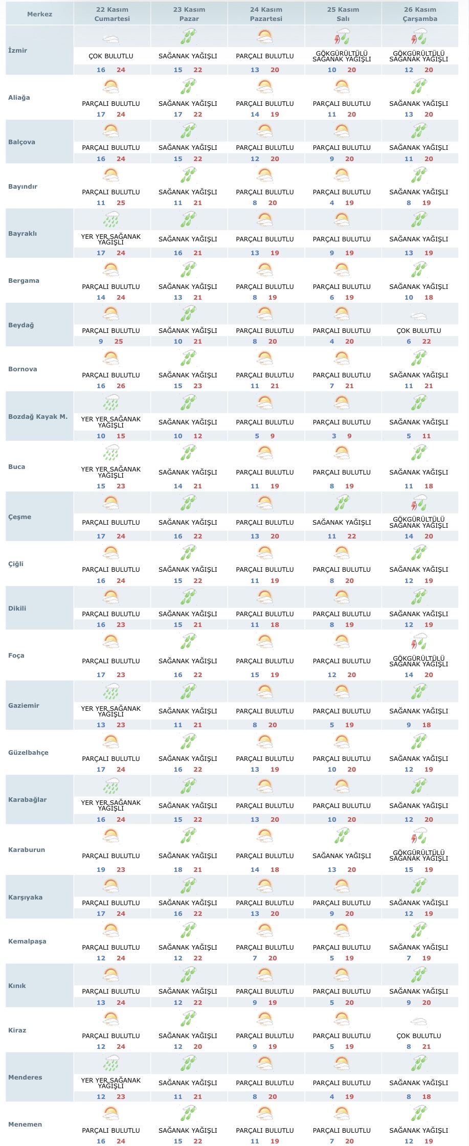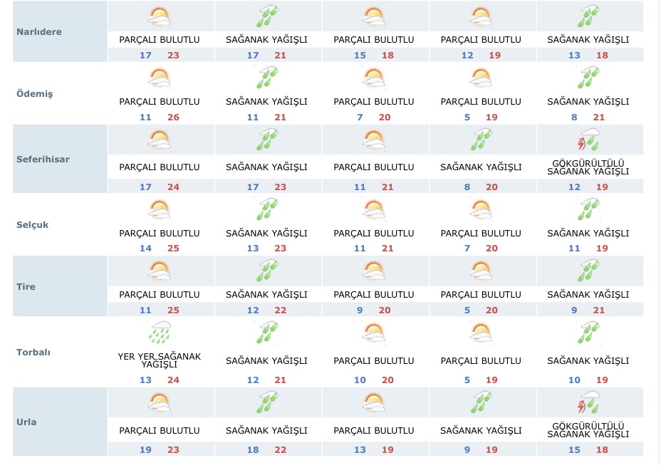 Meteoroloji Genel Müdürlüğü, İzmir’in ilçeleri için 5 günlük hava durumu tahminini yayınladı. Verilere göre yağışlı ve bulutlu bir hafta İzmir’de hakim olacak