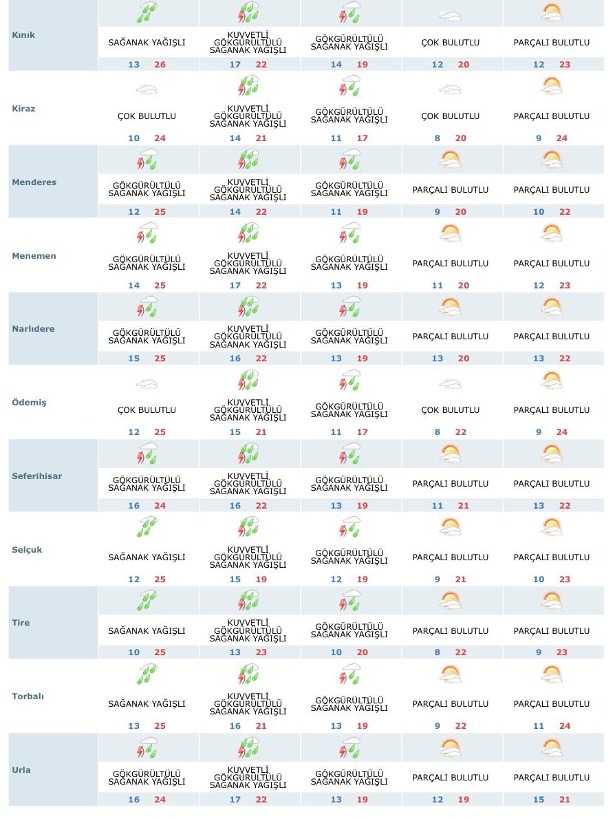 Metereoloji Genel Müdürlüğü İzmir'in ilçeleri için bir haftalık hava durumu tahminini yayımladı. Verilere göre hava sıcaklıklarının düşmesi beklenirken hafta başlangıcında şiddetli sağanak ve gökgürültülü yağış etkisini gösterecek