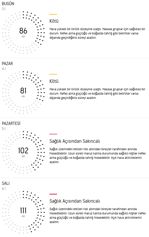 5 Ocak Pazartesi günü hava kirliliğinin daha da artacağı, AQI değerinin 102 ile “sağlık açısından sakıncalı” seviyeye çıkacağı öngörülüyor. 6 Ocak Salı günü ise hava kalitesinin 111 AQI ile aynı riskli seviyede kalması bekleniyor. Bu düzeylerde, yalnızca risk grubundakiler değil, sağlıklı bireylerin de nefes alma güçlüğü ve boğazda tahriş gibi etkiler hissedebileceği belirtiliyor.