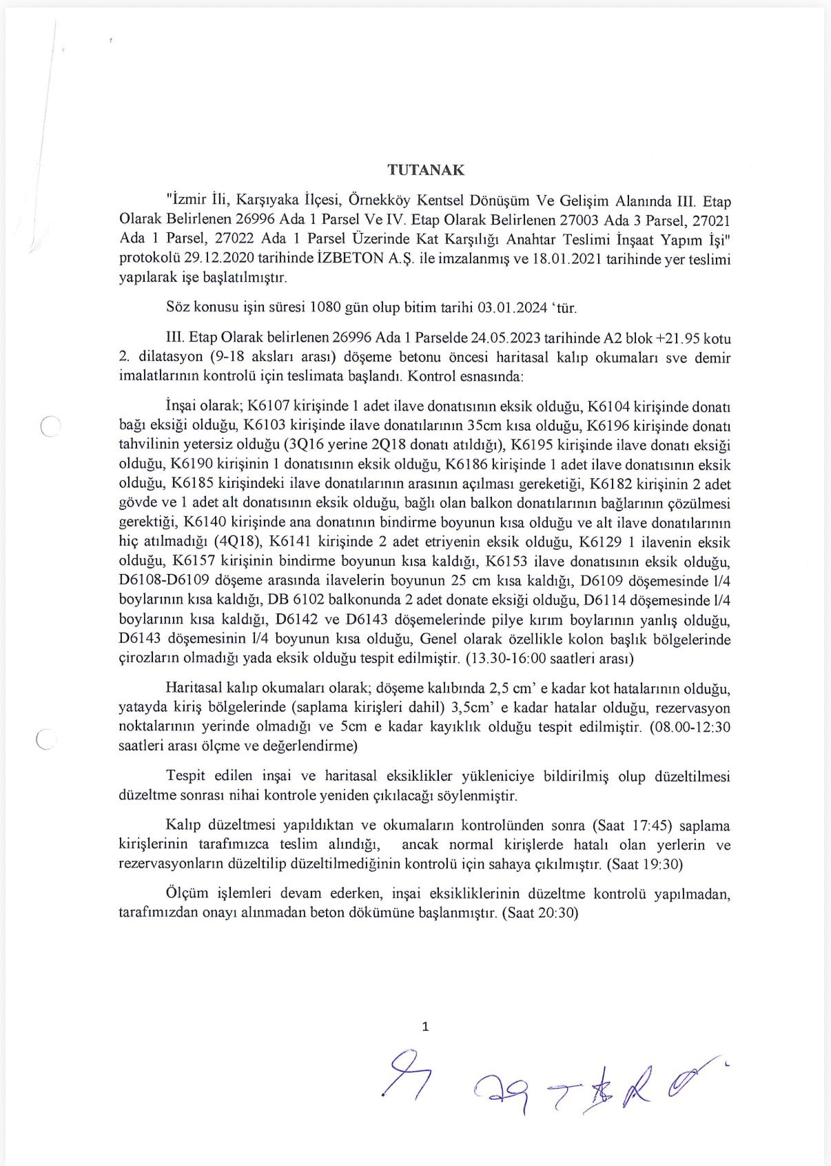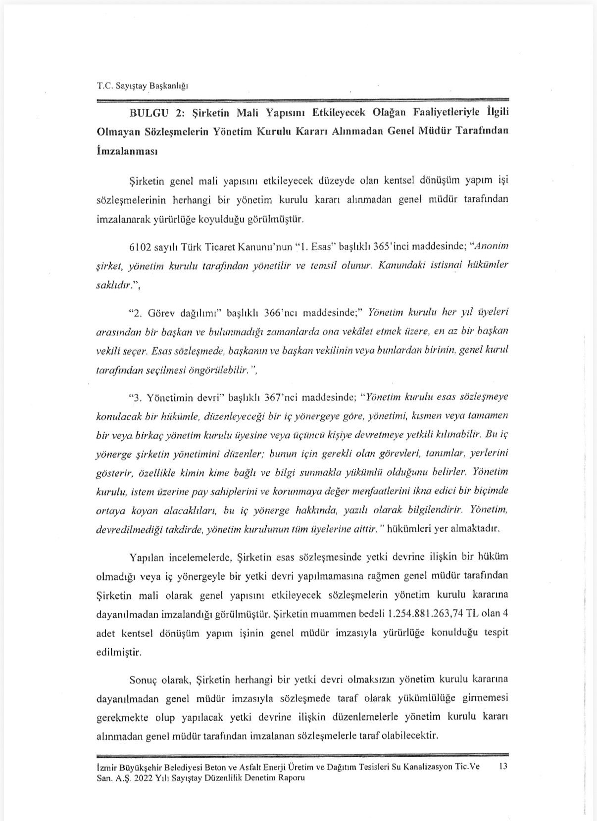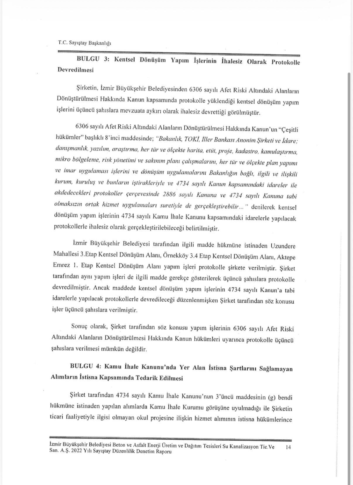 Sayıştay Başkanlığı tarafından İZBETON A.Ş. için düzenlenen 2022 Yılı Denetim Raporu’nda Kooperatifler ile imzalanan Protokoller için “Şirket tarafından söz konusu yapım işlerinin 6306 sayılı Afet Riski Altındaki Alanların Dönüştürülmesi Hakkında Kanun hükümleri uyarınca protokolle üçüncü şahıslara verilmesi mümkün değildir” değerlendirmesi yapıldı.