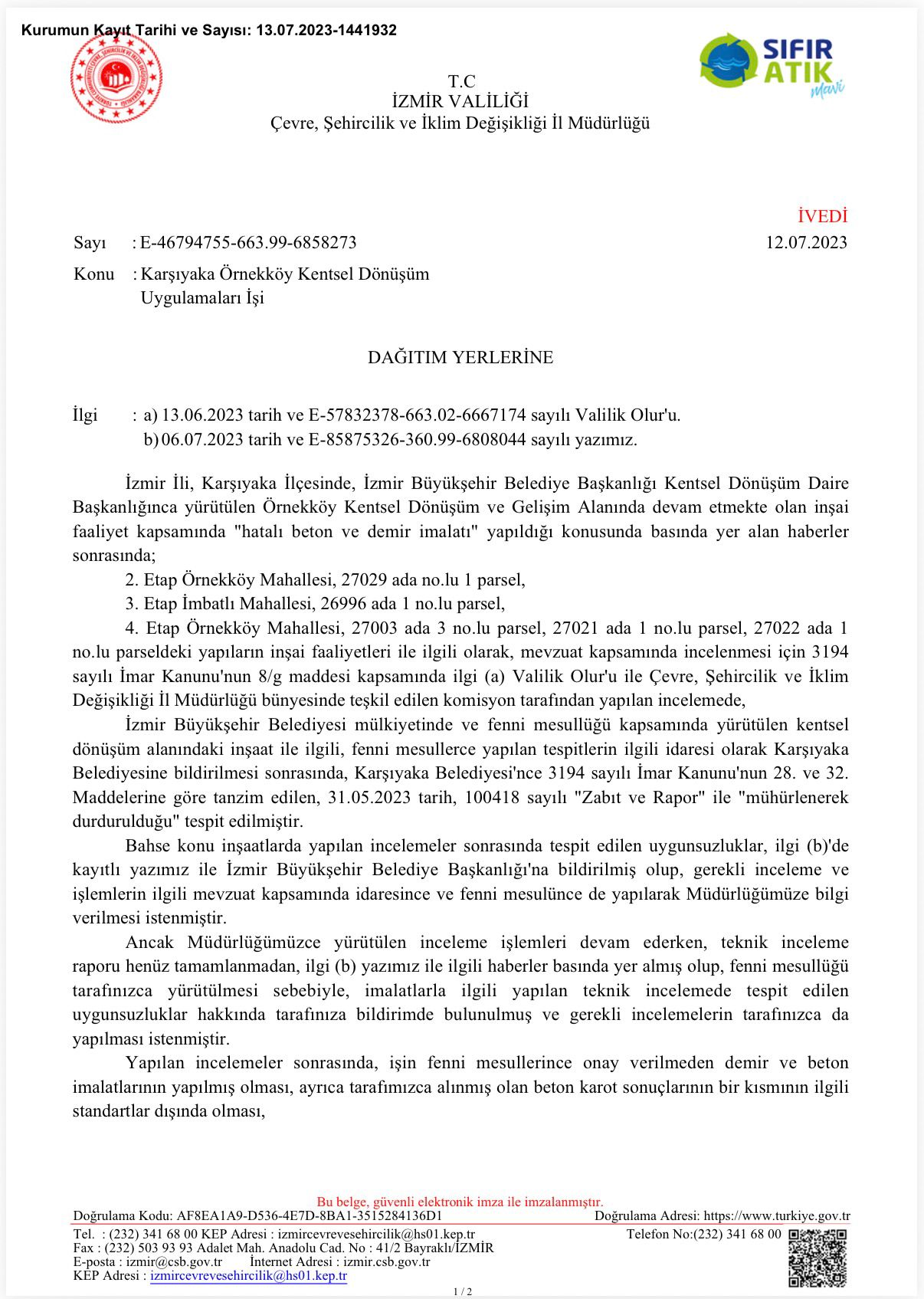 Böylece söz konuş kooperatifin başvurusuyla Çevre, Şehircilik Ve İklim Değişikliği Bakanlığı işin içine girmiş oldu. Çevre, Şehircilik Ve İklim Değişikliği Bakanlığı İzmir İl Müdürlüğü, İmar Kanunu’nun 8/g maddesi kapsamında Örnekköy kentsel dönüşüm alanında inşaat etaplarında teknik ve idari yönden yaptığı inceleme neticesinde tespit ve değerlendirmelerini belediyeye bildirdi.