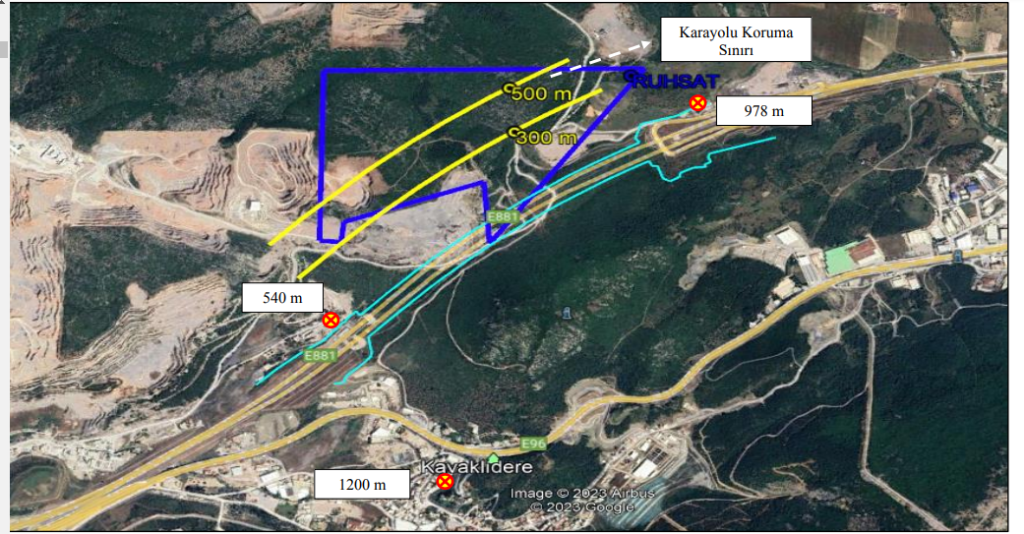 Karayolları Genel Müdürlüğünün otoyola yakınlığı nedeniyle yaptığı uyarı ÇED raporunu şu şekilde yer aldı: “Proje konusu ruhsat sahası Gebze-Orhangazi-İzmir (İzmit Körfez Geçişi ve Bağlantı Yolları Dahil) Otoyolu kamulaştırma sınırına 300 m mesafededir (Bkz.Şekil-2). İzmir Çevre Şehircilik ve İklim Değişikliği İl Müdürlüğü nezdinde yürütülen “S:20057533 İşletme Ruhsatlı Kalker Ocağı Patlatma Dizayn Değişikliği ve Proje Revizyonu” projesi ÇED sürecinde Karayolları Genel Müdürlüğü Kamu Özel Sektör Ortaklığı Bölge Müdürlüğü’nün 22.09.2022 tarihinde vermiş olduğu görüşünde otoyol kamulaştırma sınırına 300 metre mesafeden sonra patlayıcı madde kullanılmadan çalışılması yönünde görüş vermesi nedeniyle maden işletme sahasında üretim alanlarında değişiklik yapılması ihtiyacı hasıl olmuştur. Söz konusu görüş doğrultusunda otoyol kamulaştırma sınırı olan 300 metre koridorunda herhangi bir üretim yapılmayacak olup 300 m ile 500 m arasında kalan koridorda ise patlatmalı üretim yapılamayacaktır. Bu nedenle kalker ocağı üretim alanının ruhsat sahasının kuzey-kuzeydoğusuna doğru genişletilmesi planlanmış olup ÇED Yönetmeliği kapsamındaki yükümlülüğün yerine getirilmesi amacıyla işbu ÇED başvuru dosyası hazırlanmıştır.”