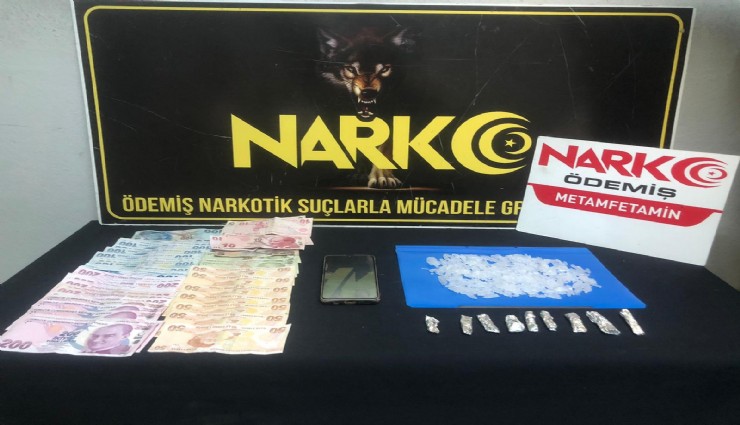 İzmir’in Ödemiş ilçesinde polis ekiplerinin takibi sonucu bir araca yapılan müdahale sonucunda E.A. isimli şüpheliden satışa hazır halde 7 paket metamfetamin, 1 adet telefon ve 5 bin 200 TL nakit para ele geçirildi. E.A.’nın evinde yapılan arama sonucunda ise toplamda yaklaşık 100 gram metamfetamin ele geçirildi.