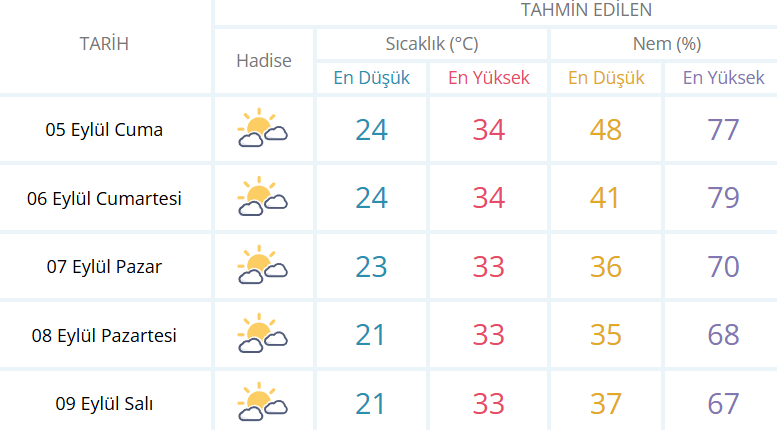 İzmir için 5 günlük genel hava raporu ise şöyle: