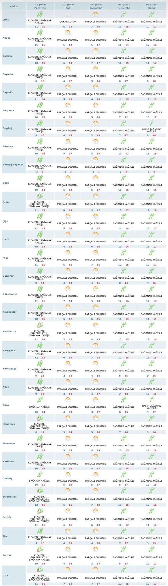 Salı ve Çarşamba günleri, yağışlı hava yerini "Parçalı Bulutlu" ve "Çok Bulutlu" bir gökyüzüne bırakacak. Bu iki günde sıcaklıklar hissedilir derecede düşecek. Özellikle Bozdağ Kayak Merkezi’nde sıcaklıkların gece -5°C seviyelerine kadar gerilemesi bekleniyor. İzmir merkezde ise Çarşamba günü en düşük sıcaklık 7°C civarında olacak.
