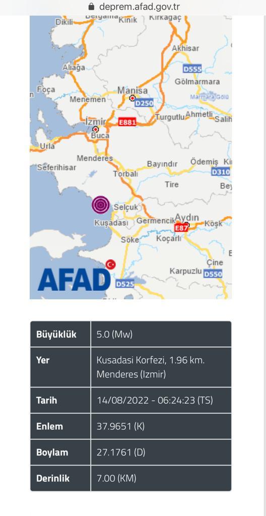 İzmir bu sabah depremle sarsıldı. AFAD 06.24’te meydana gelen 5 büyüklüğündeki depremin merkezini İzmir’in Menderes ilçesinde Kuşadası Körfezi’nin 1.96 kilometre açıkları olarak açıkladı. 7 kilometre derinlikte meydana gelen deprem İzmir’in yanısıra çevre ilçelerden de hissedildi.