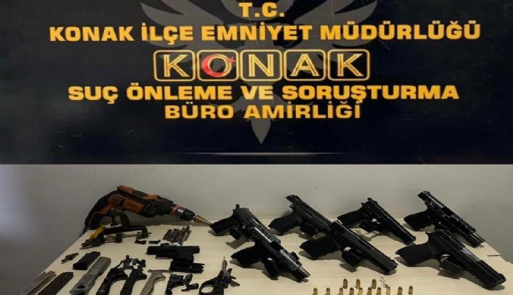 Konak İlçe Emniyet Müdürlüğü Suç Önleme ve Soruşturma Büro Amirliği ekipleri, Kuruçay semtinde bulunan bir adreste silah imalatı yapıldığı bilgisi üzerine harekete geçti. Savcılıktan alınan izinle adrese operasyon gerçekleştiren ekipler, 7 ruhsatsız tabanca, çok sayıda silah parçası ve silah yapımında kullanılan malzemeler ele geçirdi.