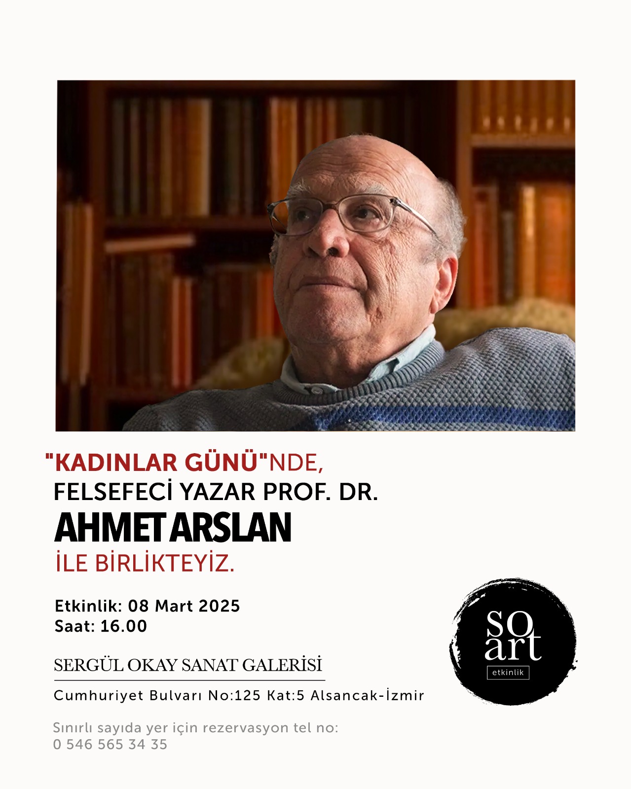 Ülkemizin felsefe alanında etkin isimlerinden biri olan Prof. Dr. Ahmet Arslan, 8 Mart Dünya Kadınlar Günü’nde Sergül Okay Sanat Galerisi’nde sanat ve felsefe üzerine sohbet edecek. Çok sayıda kitabı ve çeviri eseri bulunan, aynı zamanda Ege Üniversitesi Edebiyat Fakültesi’nde Felsefe bölümünün kurucusu olan Prof. Arslan, uluslararası alanda da etkin bir kariyere sahip… Prof. Arslan ile dinleyicileri, Sergül Okay Sanat Galerisi’nde yarın saat 16.00’da bir araya gelecek..