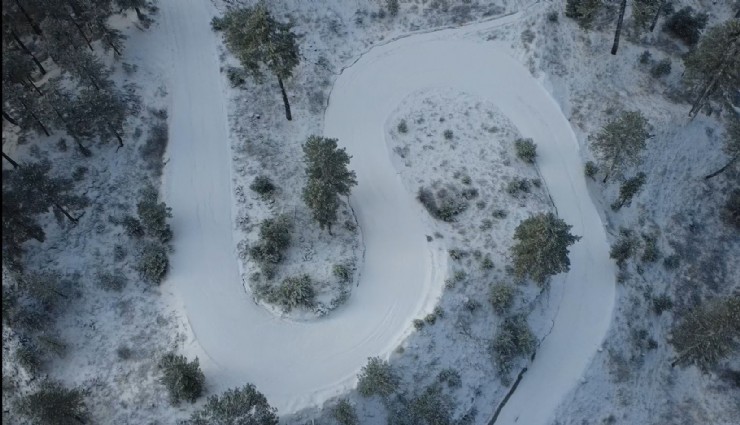 Drone ile kaydedilen görüntülerde, karla kaplanan dağ silsileleri, ormanlık alanlar ve kıvrılarak uzanan yollar görsel bir şölen sundu.