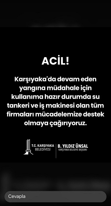 İzmir’in Karşıyaka ilçesinde 24 saati aşan yangın kent merkezinde Çiğli, Bayraklı ve hatta Bornova’ya doğru ilerlerken mücadelede dört bir koldan devam ediyor. Valilik, Büyükşehir Belediyesi ve ilçe belediyesi ekipleri var güçleriyle yangını kontrol altına almak için çaba harcıyor. Bu arada Karşıyaka Belediye Başkanı Yıldız Ünsal’dan da acil bir çağrı geldi. Ünsal sosyal medya hesabından “acil” başlığıyla yayınladığı çağrıda, “Karşıyaka’da devam eden yangına müdahale için kullanıma hazır durumda su tankeri ve iş makinesi olan tüm firmaları mücadelemize destek olmaya çağırıyoruz” ifadelerini kullandı.
