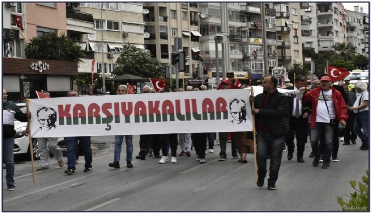 Daha sonra yürüyüşe katılan kalabalık grup Zübeyde Hanım Caddesi, İstasyon, Karşıyaka Çarşısı ve Vapur iskelesi'nden Atatürk Anıtı'na kadar, marşlar, türkü ve şarkılar söyleyerek yürüdü.